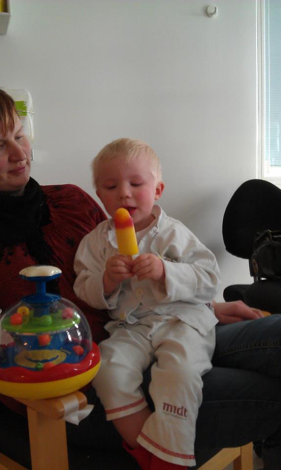 På opvågningen kom Silas hurtigt til sig selv, og startede med at lave “ballade” over venflonen i hans venstre hånd. Sygeplejersken i opvågningen ville først ikke tage den ud, fordi hvis han blev dårlig, og de skulle bruge den igen, så ville det være synd at skulle stikke igen….. Efter kvarter med jammer og protester over venflonen (som var blevet pakket ind i en større forbinding, og som vi forsøgte at få ham til at ignorere) så mente sygeplejersken ikke, at Silas så ud til blive dårlig og gav så efter og pillede den ud.