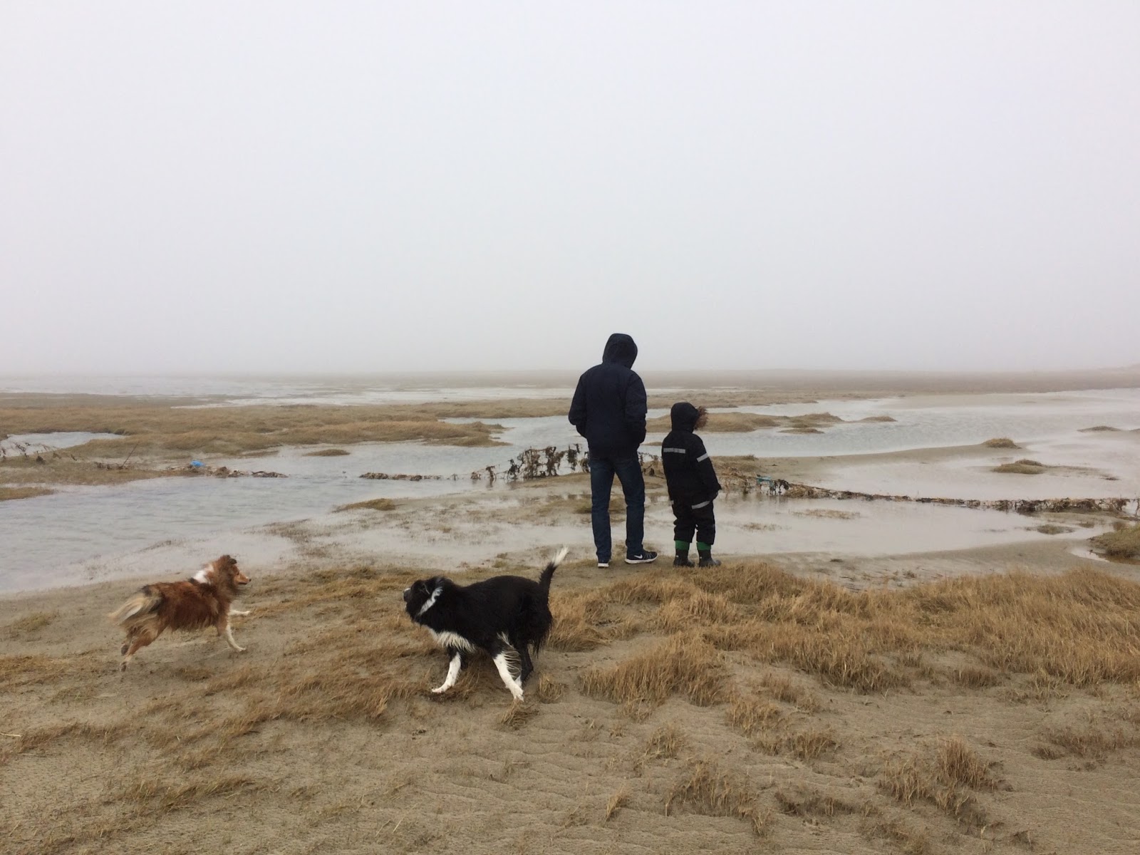 Søndag efter de obligatoriske hjemmebagte boller blev vi enige om at køre de små 20 km til Rømø og gå en tur der. Det var temmelig tåget og luftfugtigheden var så høj, at det næsten var som regn, når blæsten slog ind på en. Der var ikke mange mennesker på Rømø, og Fuji og MicMic festede total rundt på det lave vand. Ninja måtte finde sig i, at turen for hende foregik i snor, da hun om lørdagen desværre haltede lidt efter lørdagens gåtur. Så hun var dømt i snor, indtil jeg havde fået kigget nærmere på det.