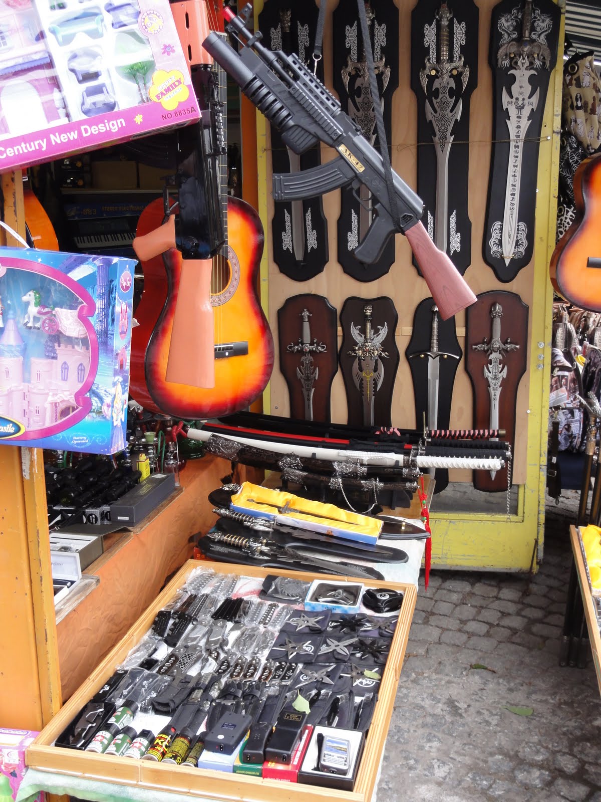 Tobias ville meget gerne ud på det “gule marked” og se, hvad det kunne byde på af billige kopivarer. Vi ved ikke helt, hvorfor det hedder det gule marked, men vi gættede på, at overvægten af asiatisk styrede boder kunne have noget med det at gøre. Næsten alle boder havde de samme ting at byde på – kopivarer i lange baner. Men også en masse former for våben: kastestjerner, knive, knojern og “slagtøj” i varieret udvalg. En af boderne havde også plastic skydevåben hængede. Jeg gætter på, at det var et signal om, at de også kunne skaffe noget mere gedint.