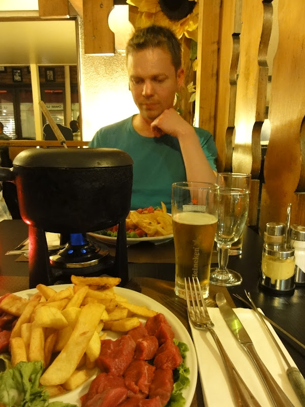Vi fandt en restaurant på hjemvejen og bestilte en gang fondue. Vi undrede os begge over, at det rå kød lå op af de stegte pomfritter. Ikke lige den lektie vi har lært om fødevarehygiejne. Efter den lange travetur, som jeg anslår til 15-20 km, så var øllene til maden noget af det mest himmelske, vi begge havde smagt længe.
