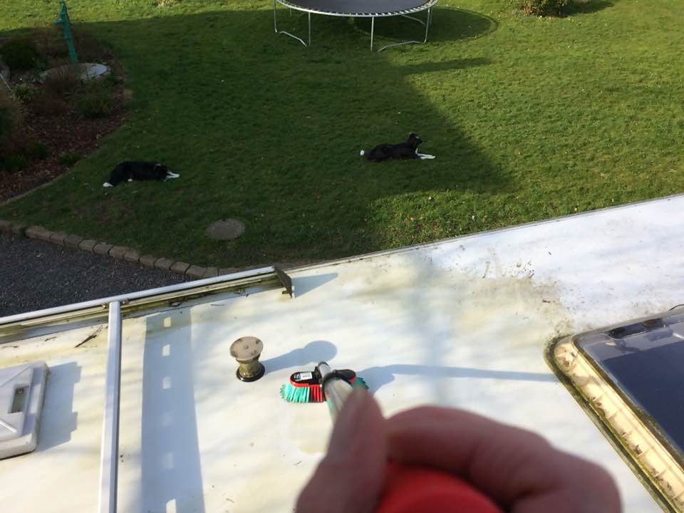 | Vask af taget på campingvognen |