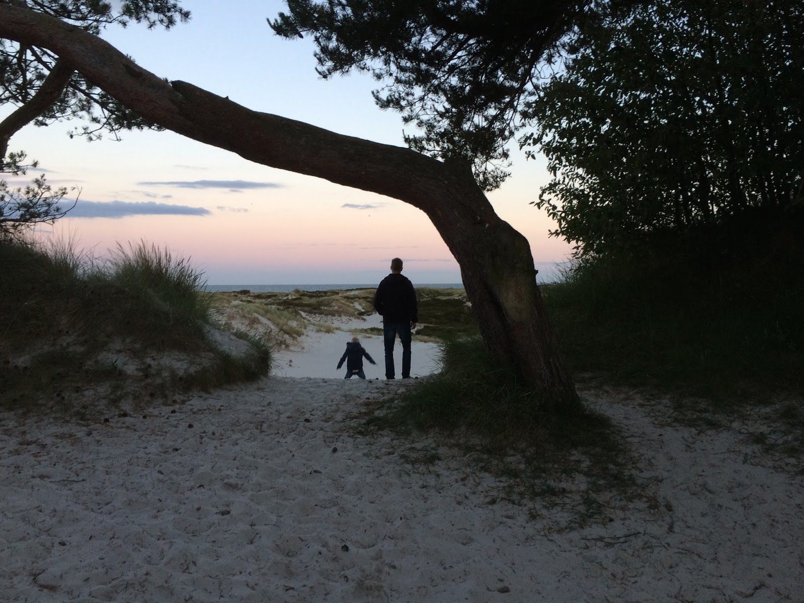 Dueodde og indtage vores take-away aftensmad. Silas var meget betaget af det dybe hvide sand i de høje klitter. Desværre var det blevet pivkoldt og blæsende, så vi nåede ikke ned til vandet. Det var simpelthen for koldt og blæsende.
