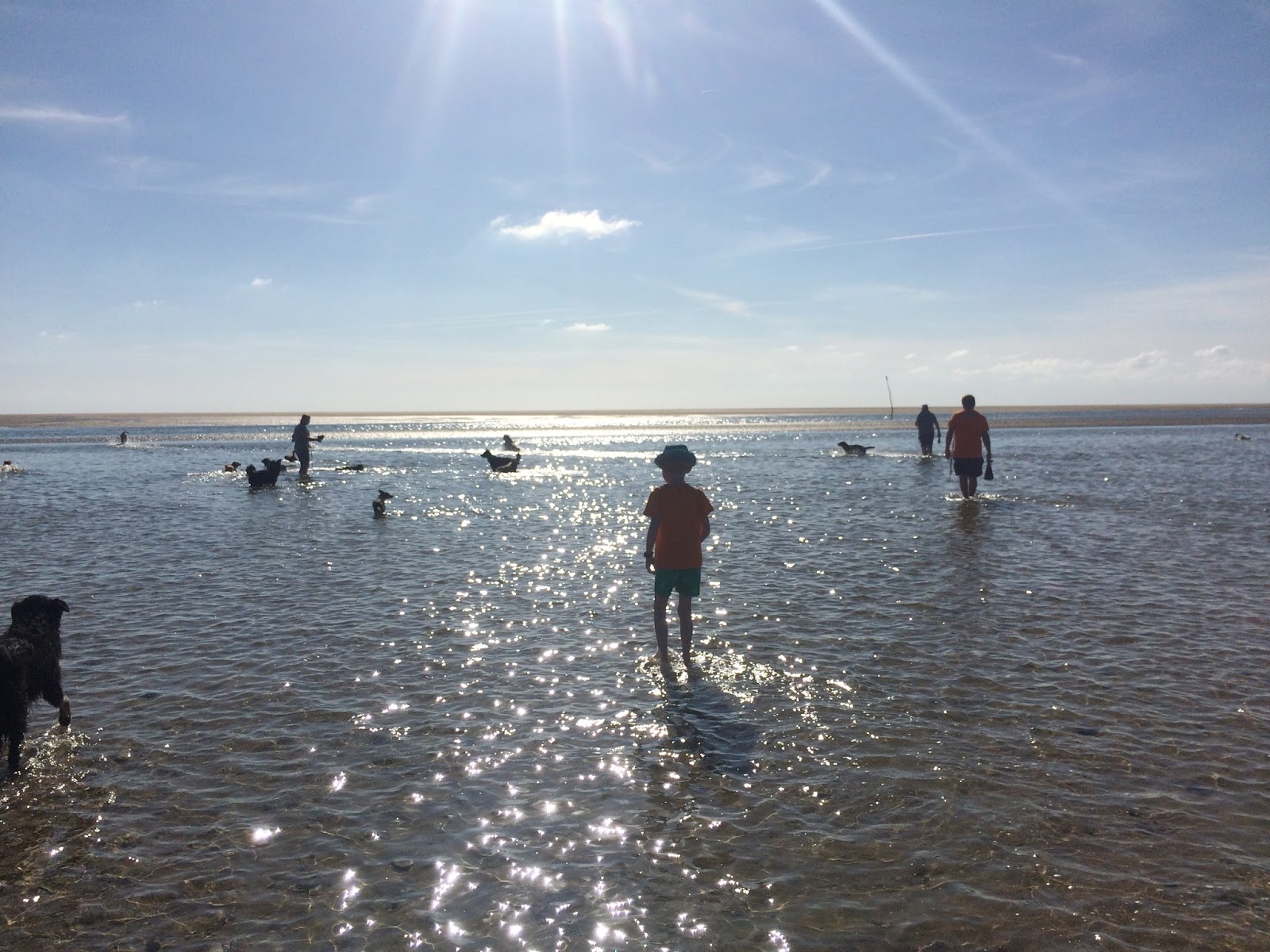 Planen var, at vi om eftermiddagen, når der var lavvande ville gå ud til sejlrenden sammen med alle hundene og bade. Jeg indrømmer, at jeg var en anelse skeptisk og tænkte, at det nok var alt for koldt at bade, men Silas og jeg tog alligevel badetøj på under vores tøj.